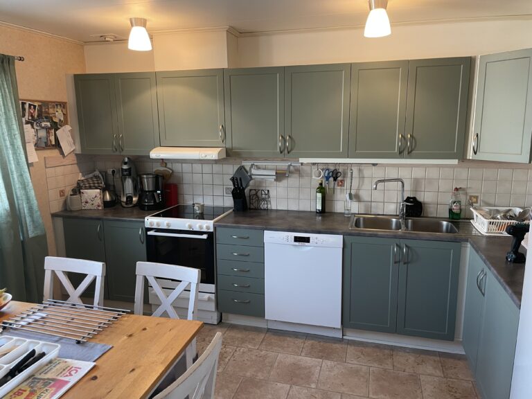 Denna kund i Nora hade tröttnat på sitt IKEA-kök och ville byta ut luckor & lådfronter mot vår Kustgröna! Kunden tvekade lite vid valet av