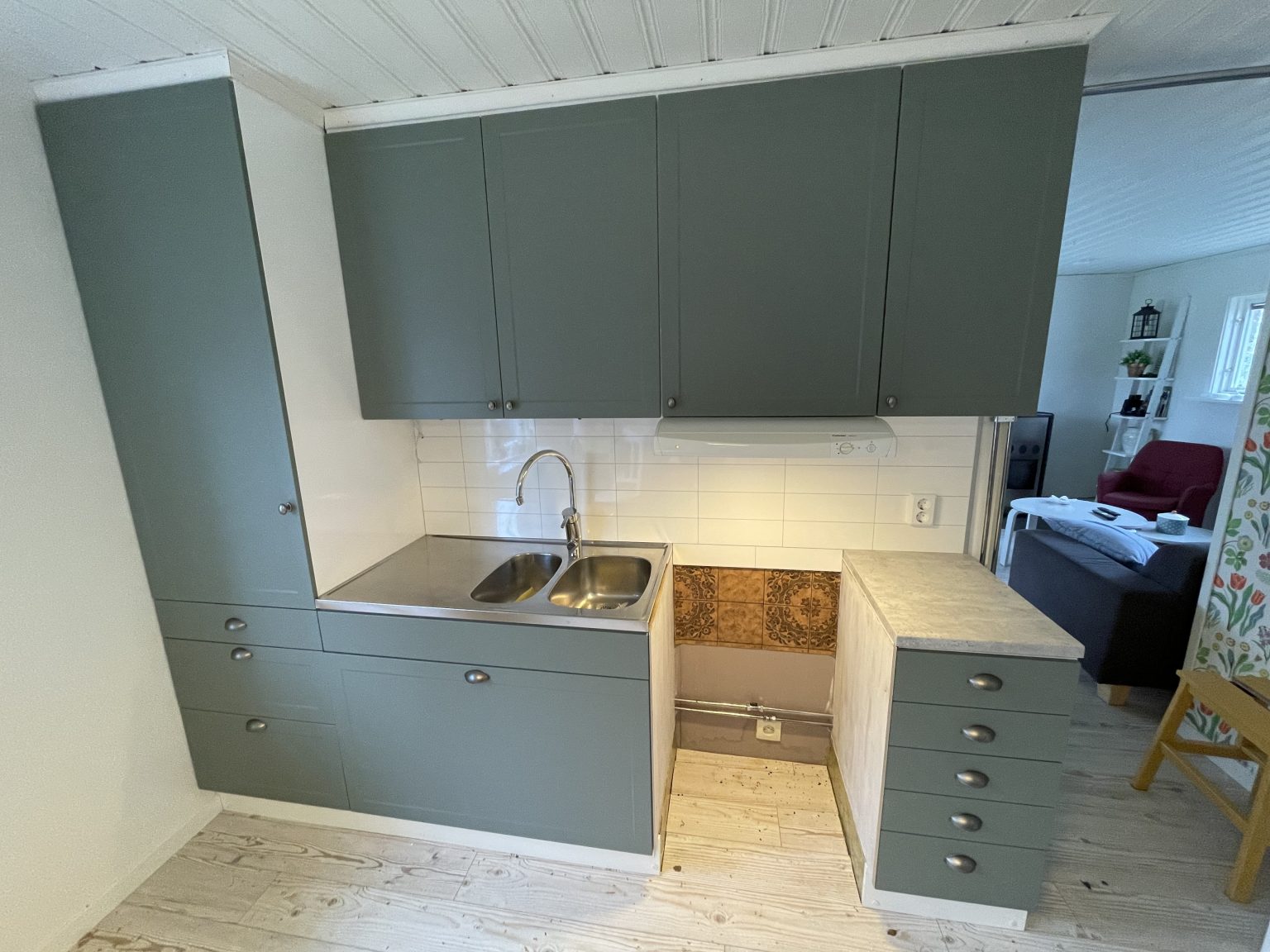 Denna kund valde att byta allt i köket utom stommarna. En av stommarna byttes ut mot en bredare. Vi bytte även bänkskiva med tillhörande diskho